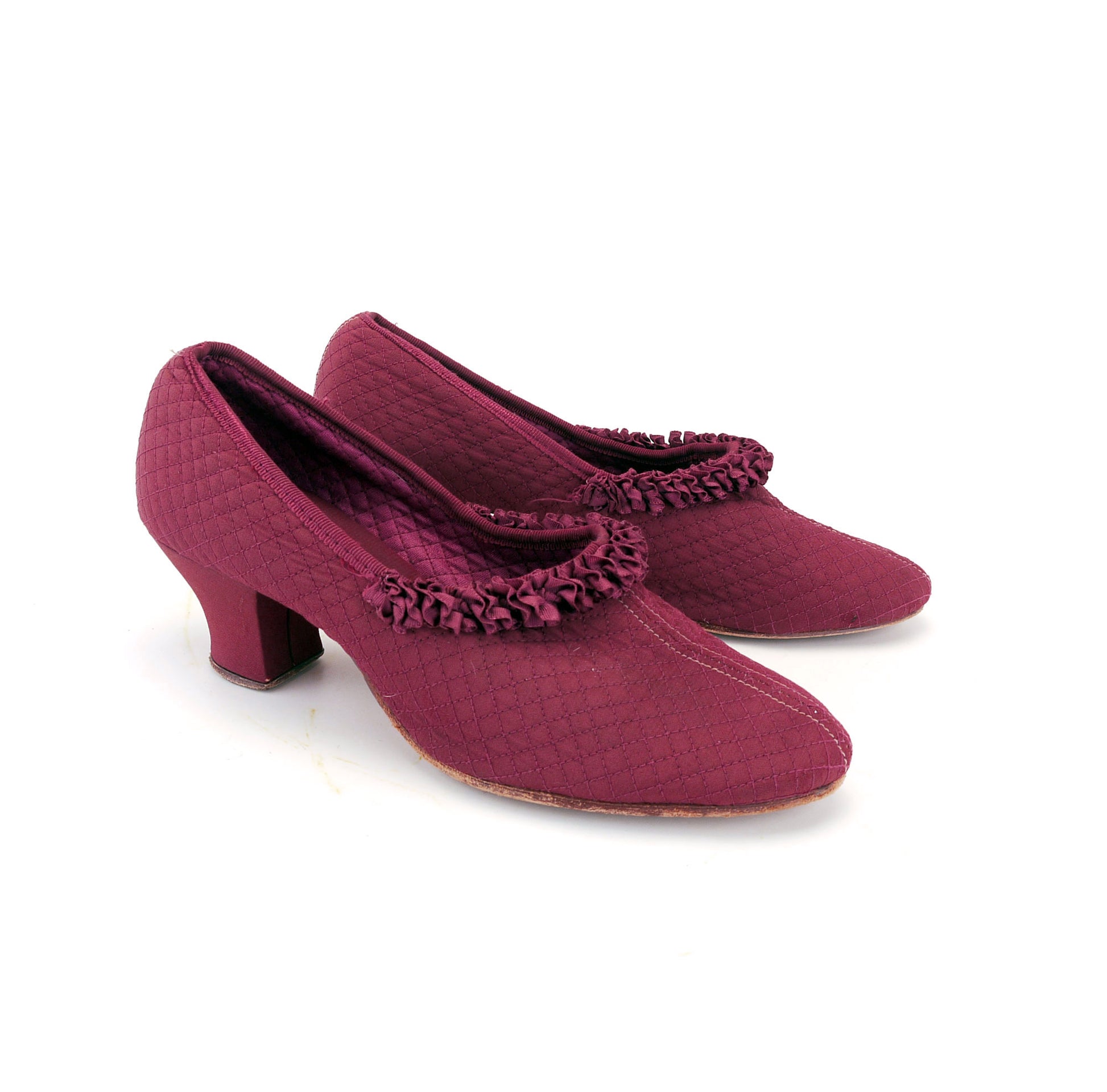 Quilted pump in wine rayon or cotton with a high cut vamp, almod toe and 2.25 inch Louis heel. tha fabric is lightly padded with a plain diamond quilting pattern, and trimmed by a ruched ribbon. Textile upper and lining, leather soles.