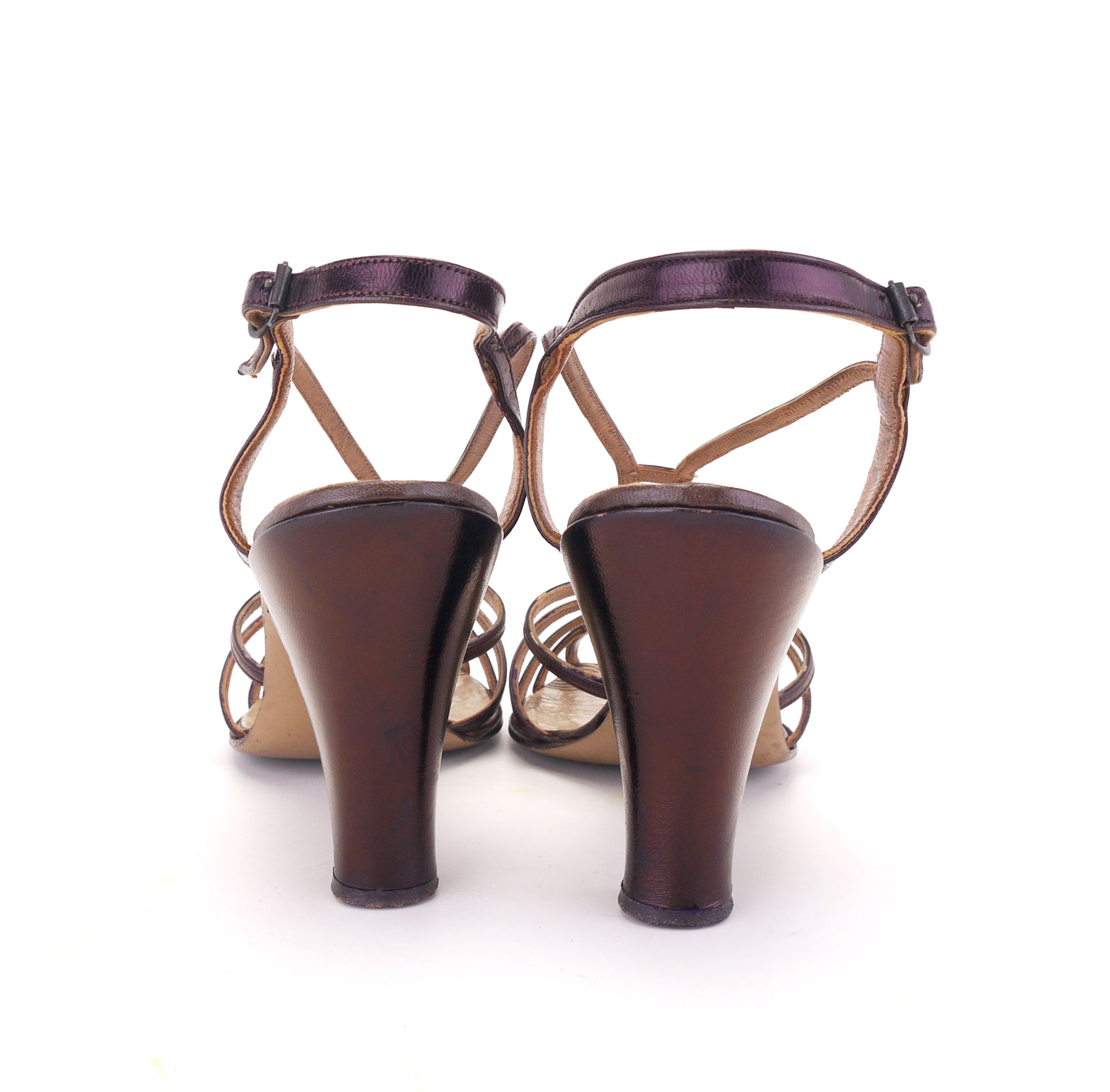 Late 40s or early 50s barely there sandals in metallic bronze leather with a Y stap and buckled slingback. 3.5 inch Spanish heel. Very shiny, alternate aubergine/gold as they move. Leather upper, lining and soles.