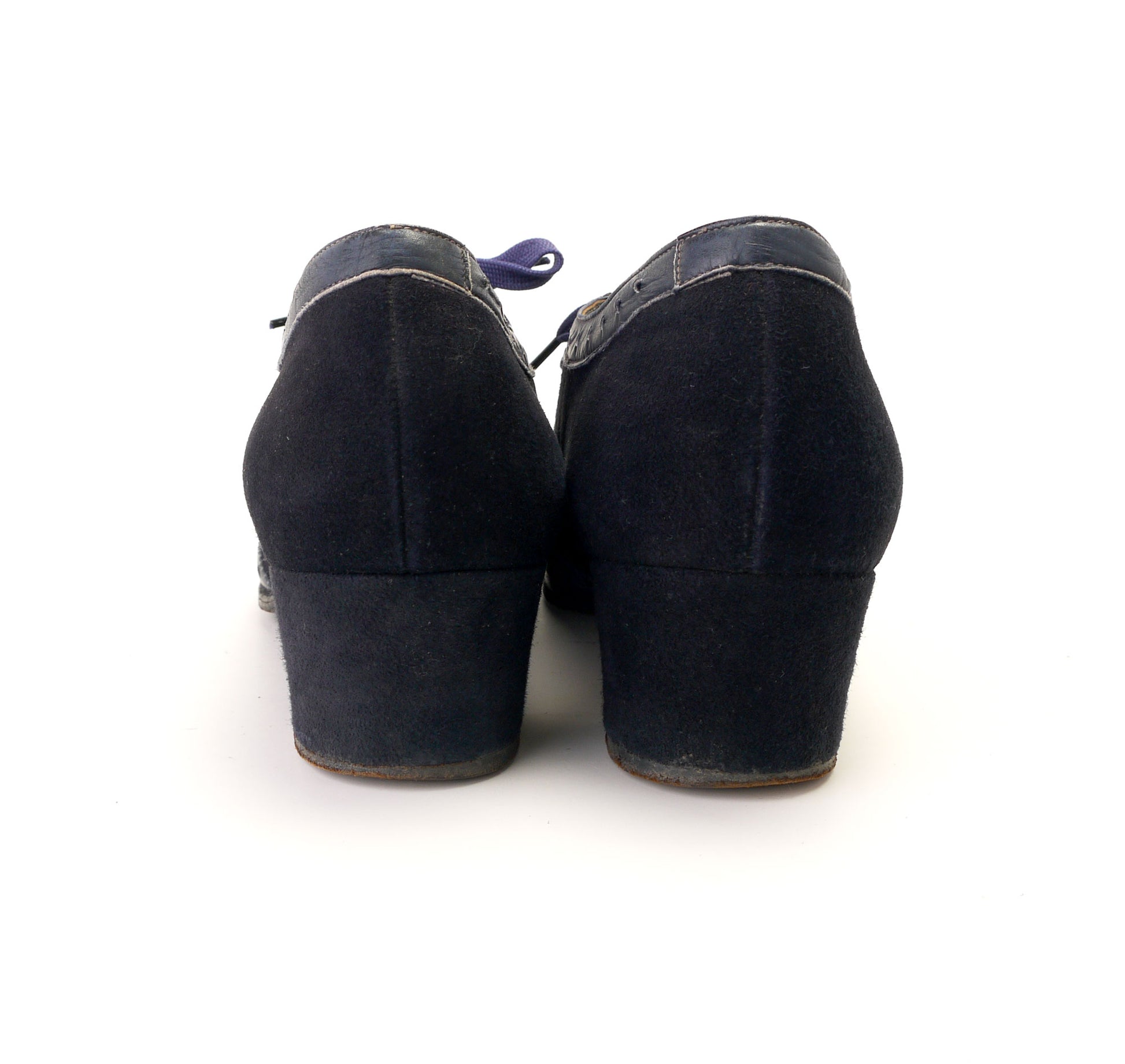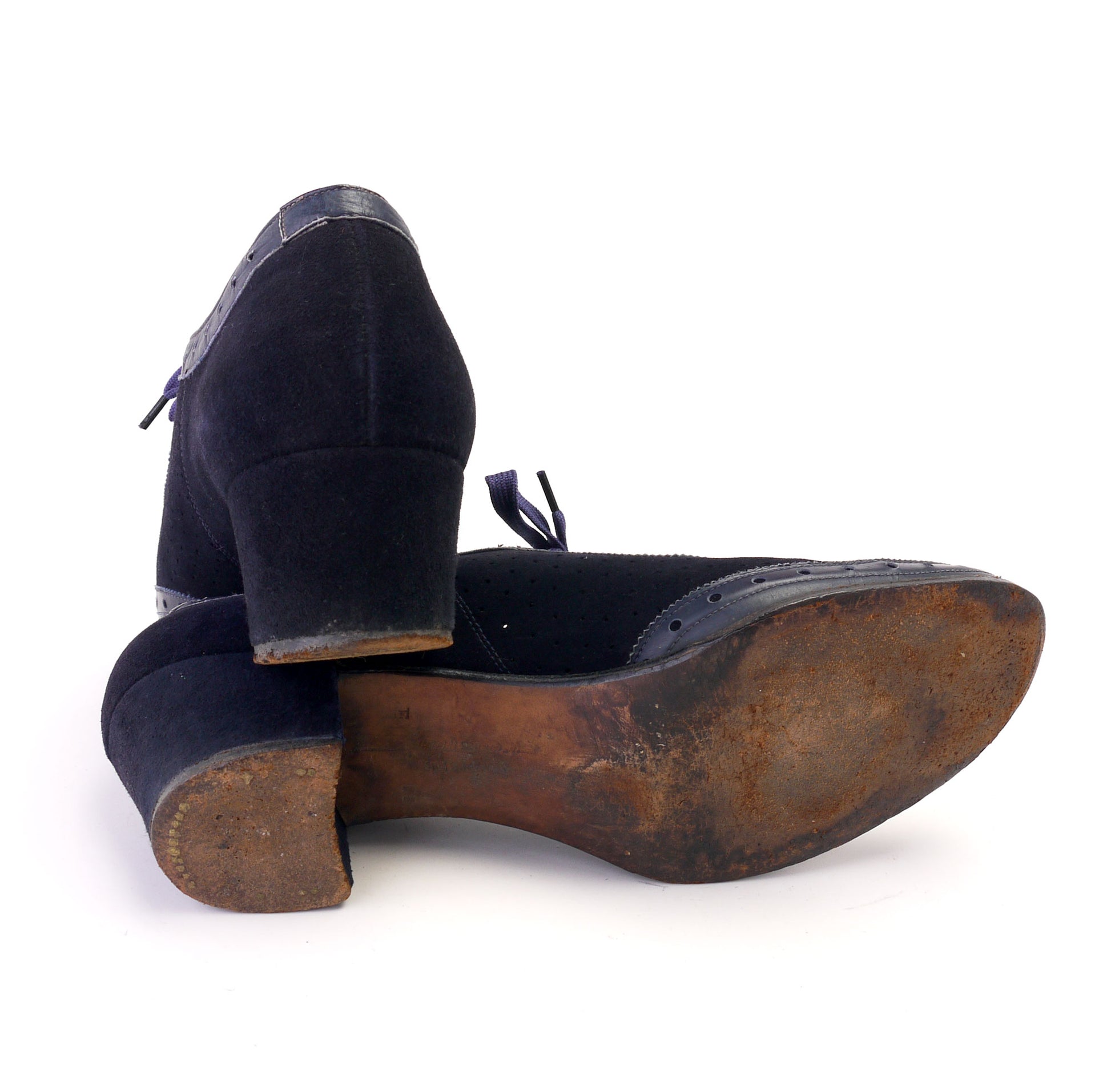 NAvy suede and leather open laced shoes with a rounded toe and 2 inch block heel. Hand made to a late 30s style. Perforated suede upper with a leather mudguard, collar and lace tabs. Dark navy, the laces are new old stock and a bit paler. Leather upper, lining and soles.