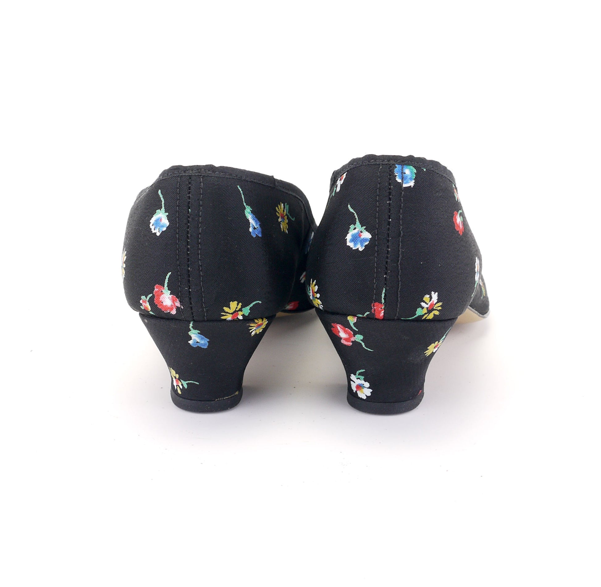 Printed black rayon indoor slippers with a 1.75 inch heel and pointed toe. Wide fit. Blue textile lining.