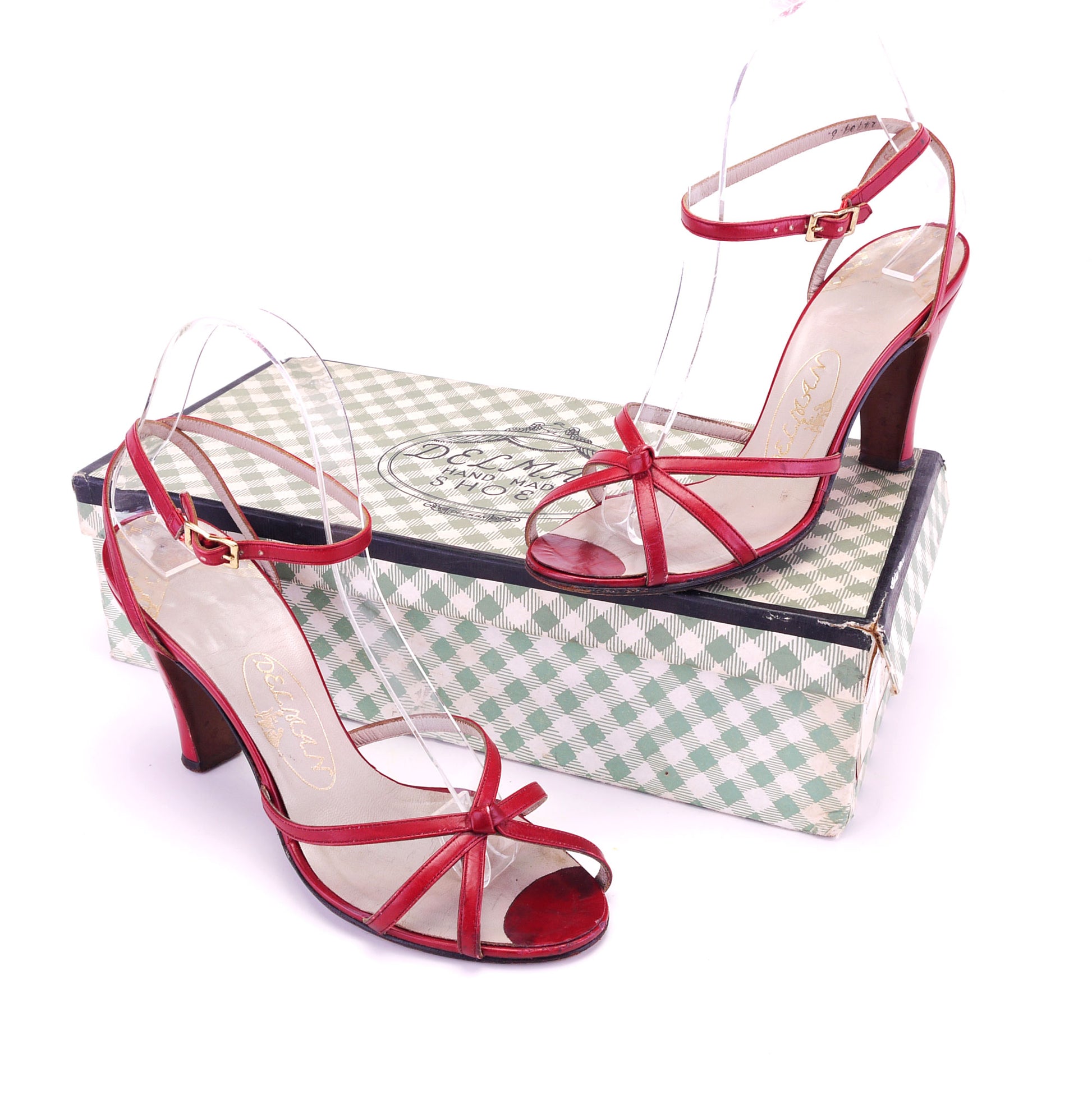 Designed in 1951 by Edward Rayne and very popular throughout the 50s and early 60s, this 3 strap sandal revealed the whole foot (in stockings of course). This pair in cherry red leather (darker than photos) have a 3.5 inch Spanish heel and slim ankle strap and were made for Rayne's sister company Delman. Leather upper, lining and sole, contemporary box.