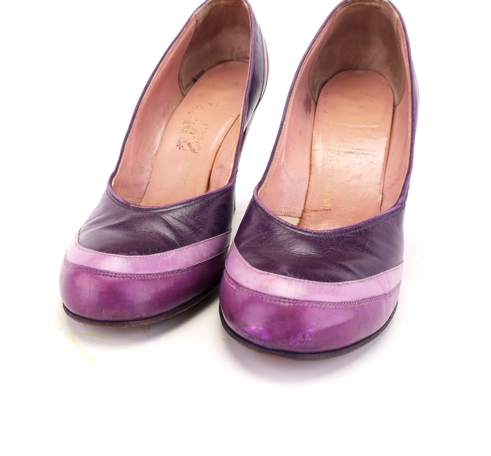 3 shades of purple!! elegant early 50s pumps in purple, lilac and plum. rounded toe, 3.75 inch Spanish heel and low cut vamp. De Liso Debs by Plater De Liso. All leather exterior with leather and textile lining.