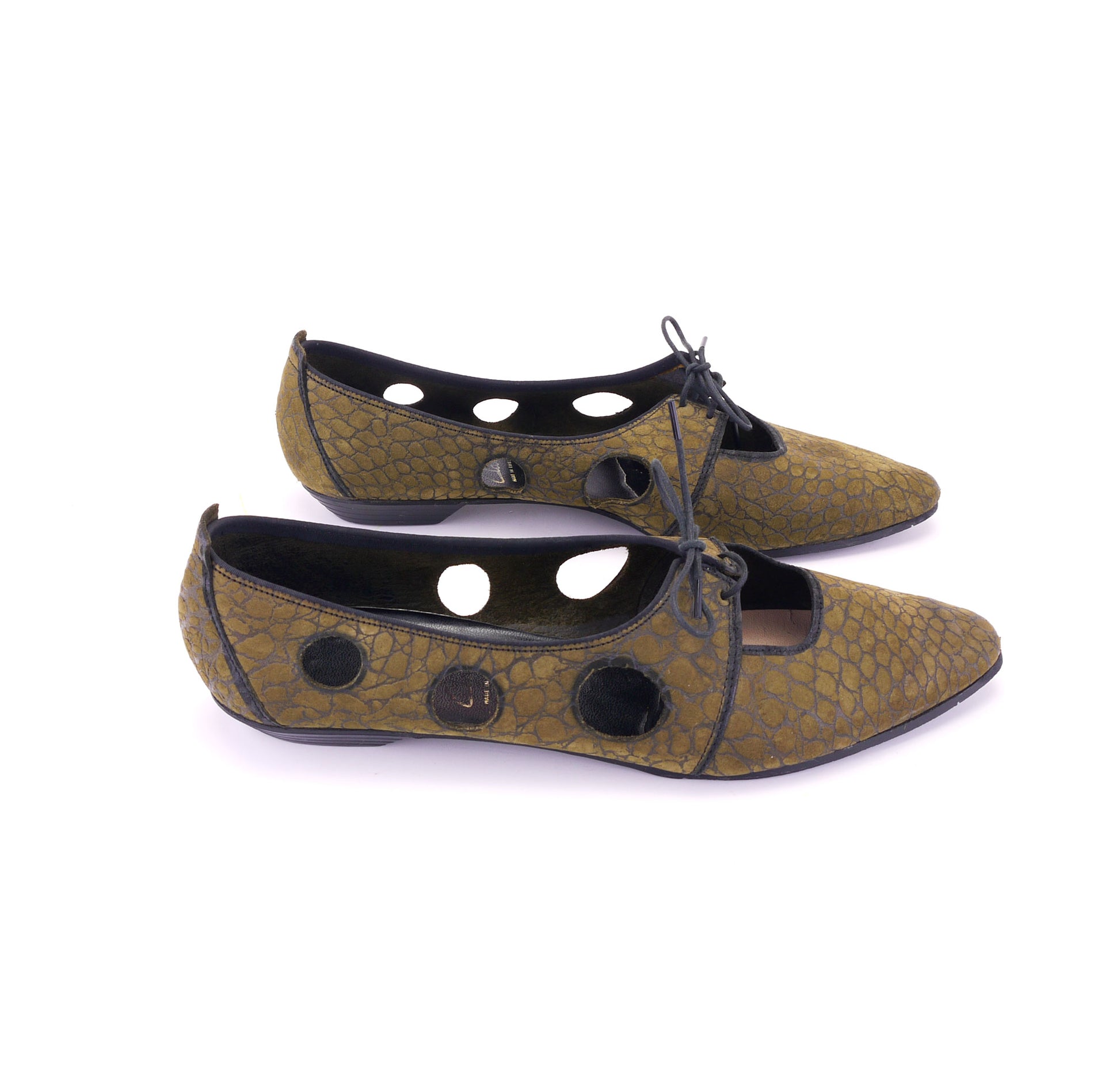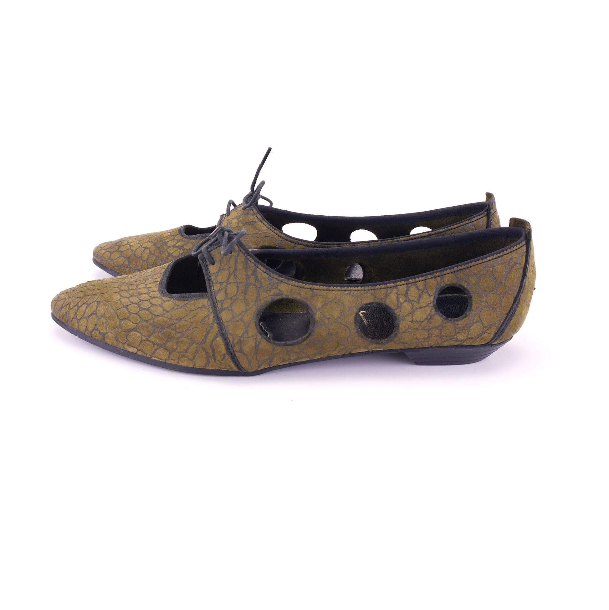 Quirky 60d flats in dark khaki suede, embossed to look like croc. Round cutouts on the sides and a lace tab with keyhole forming a bar shoe. rounded point toe, 3/4 inch moulded heel. Leather upper, unlined, moulded resin sole and heel.