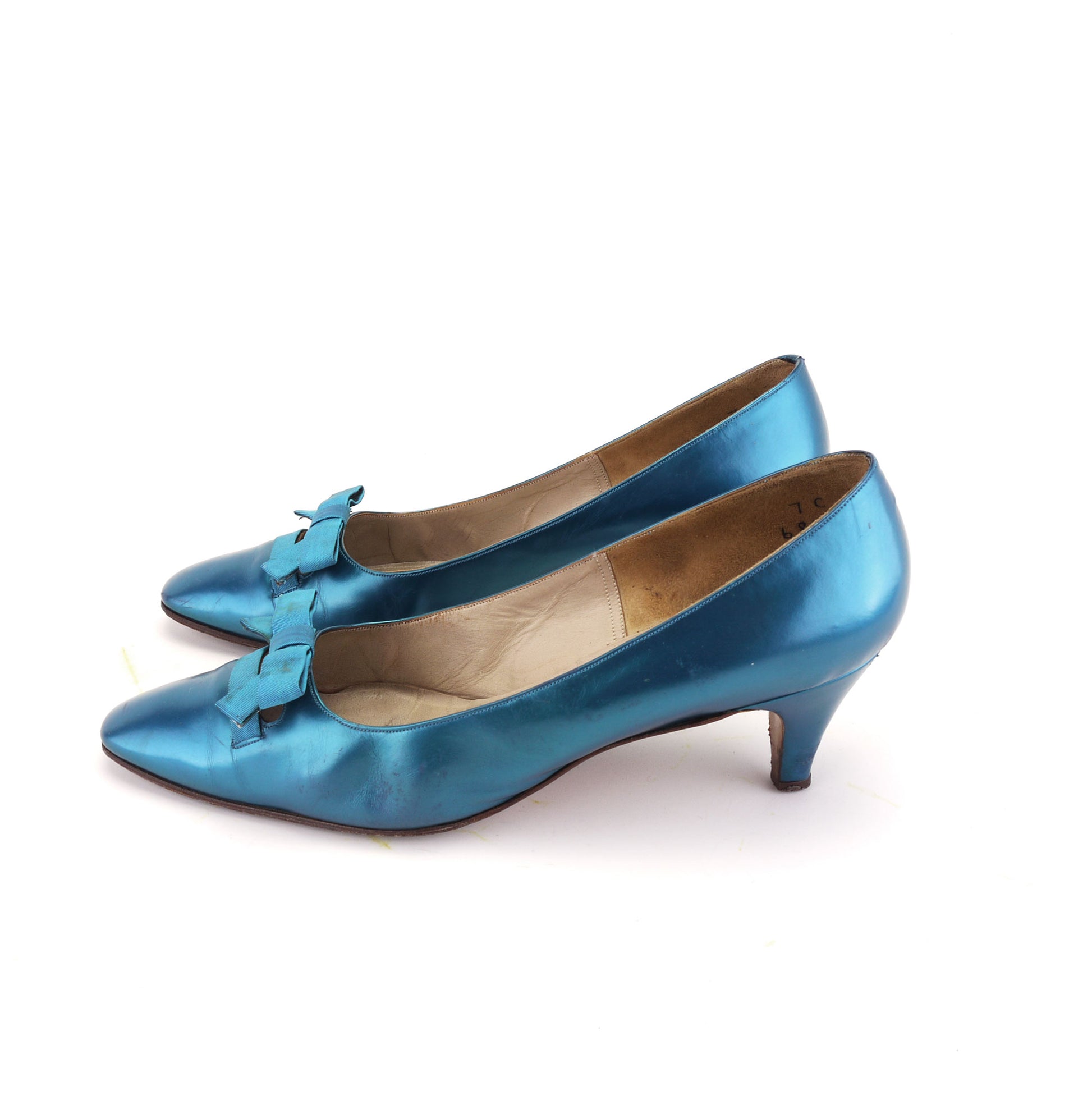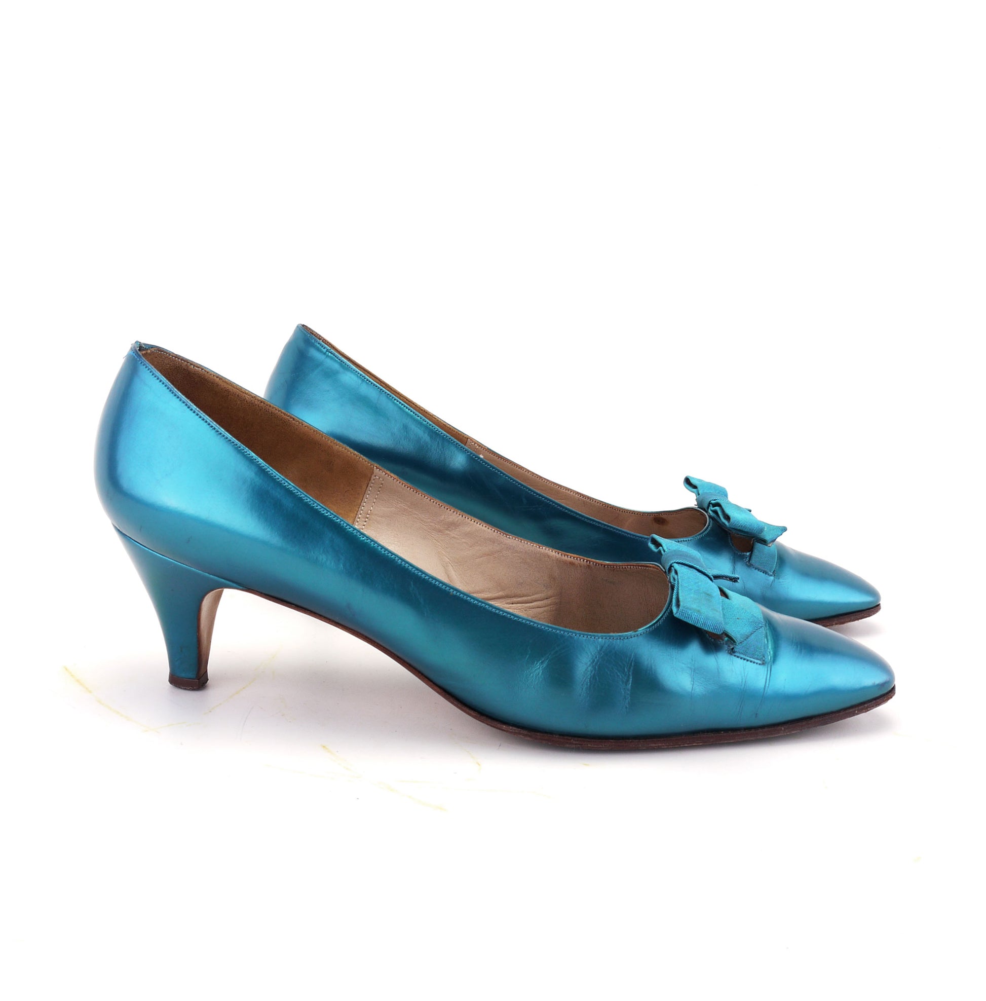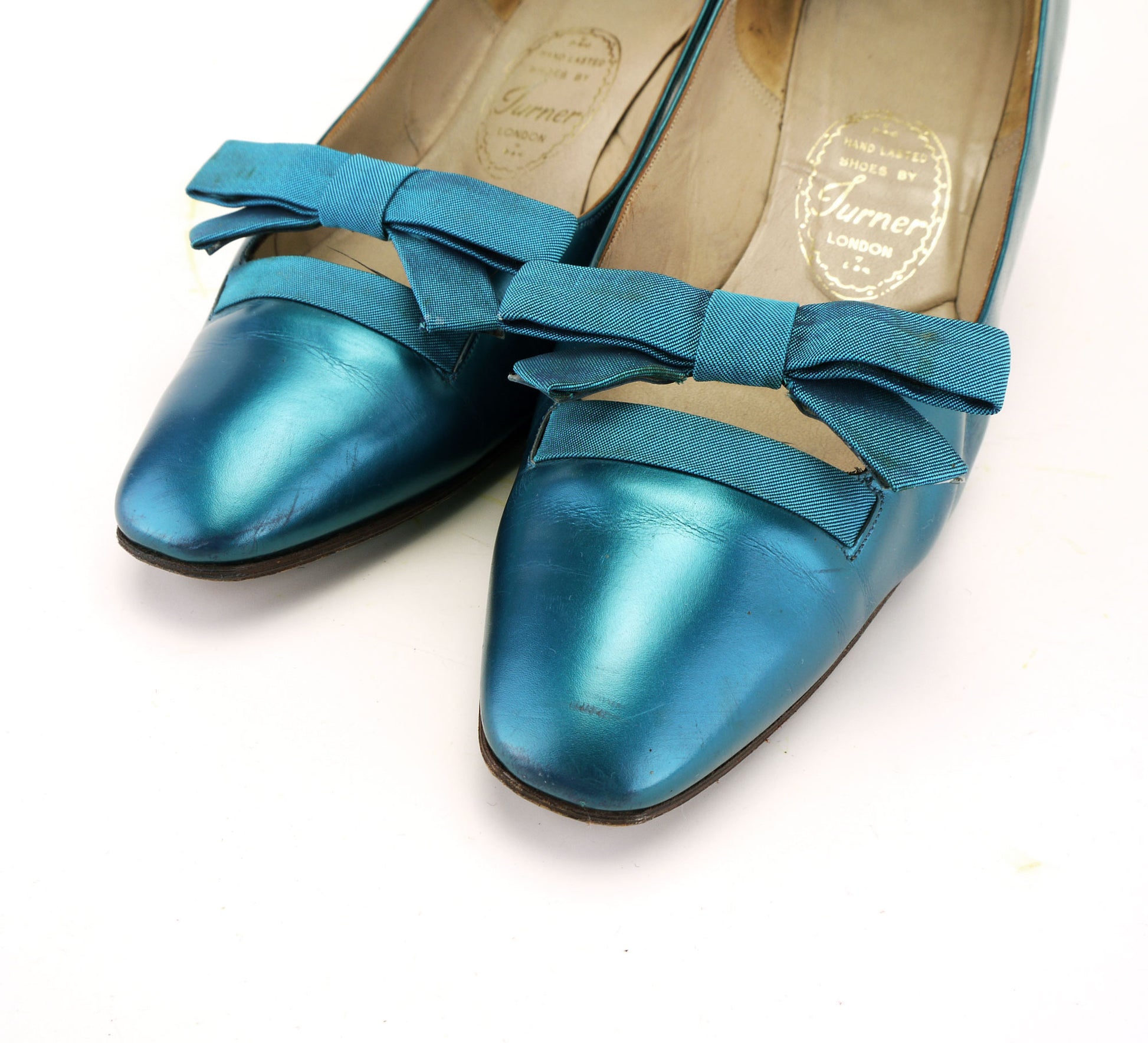 Intense metallic turquoise / peacock / teal pumps by Turner. Mid 60s with a short 2.5 inch straight heel and gently pointed toe that is chiselled. Bow trimmed with matching ribbon over a keyhole . All leather.