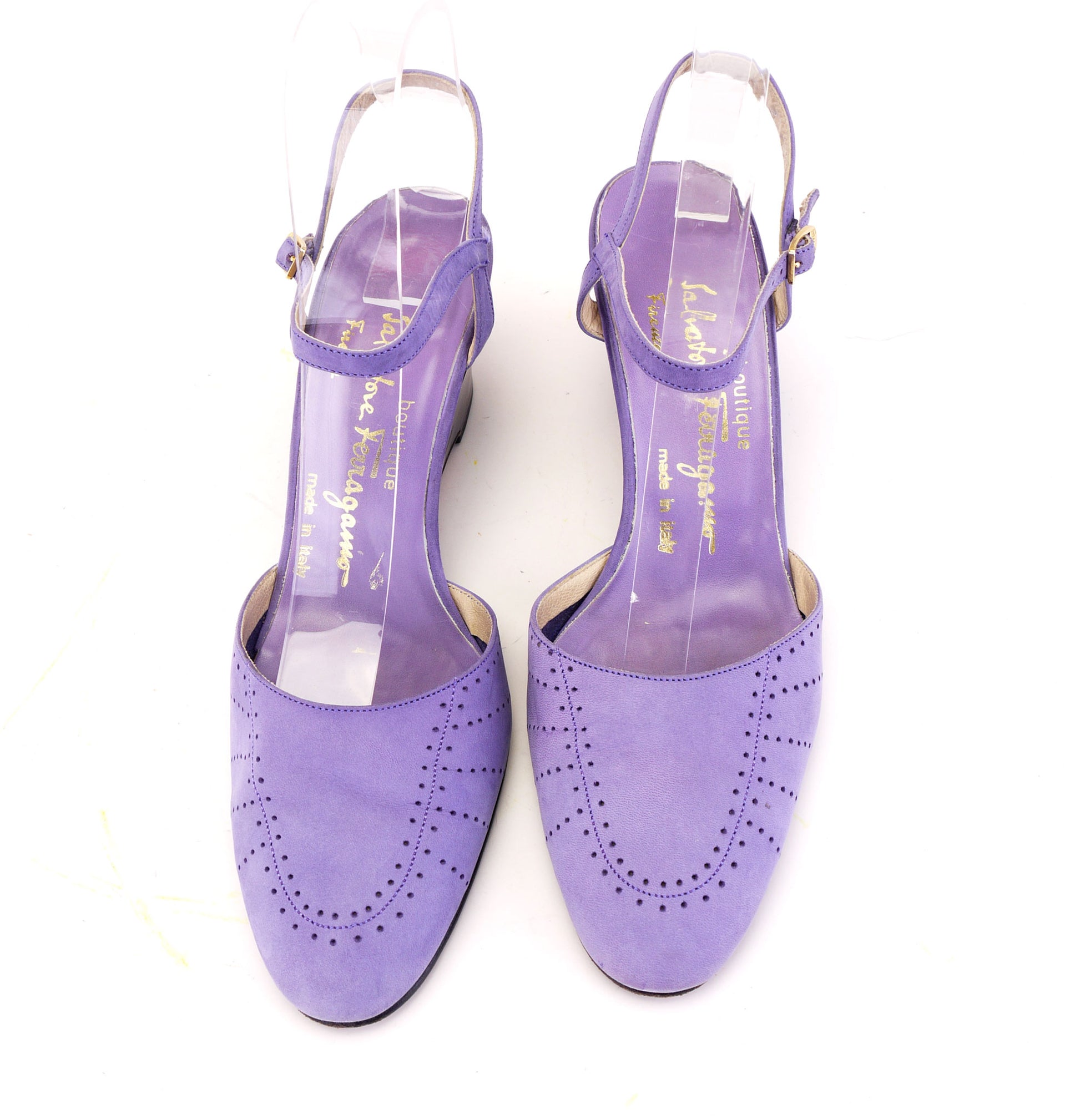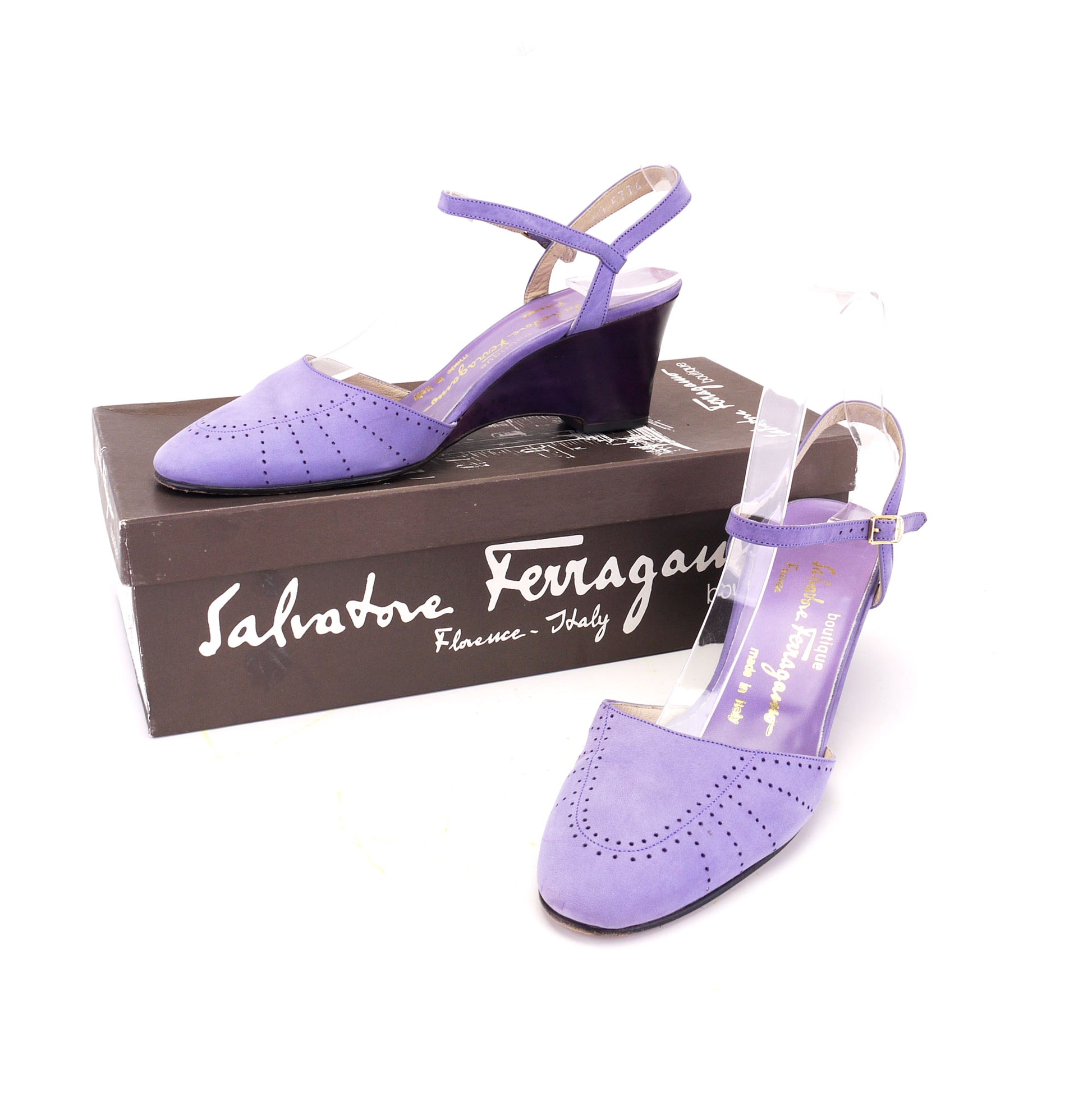 Early 1970s wedges by Salvatore ferragamo Boutique. Lilac nubuck upper with a pierced vamp and slim sandal straps, gilt buckle. 2.75 inch dark purple leather heel. Leather upper and soles, unlined.