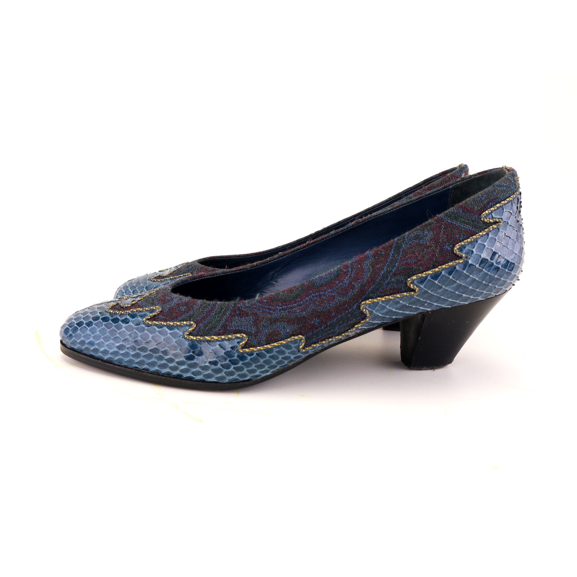 Mid blue pumps with an almond toe and 2 inch black stacked heel. The upper is petrel blue snakeskin piped with gold/blue cord and blue/burgundy brocade. With a contemporary box and bag. Leather and textile upper, leather lining and soles.