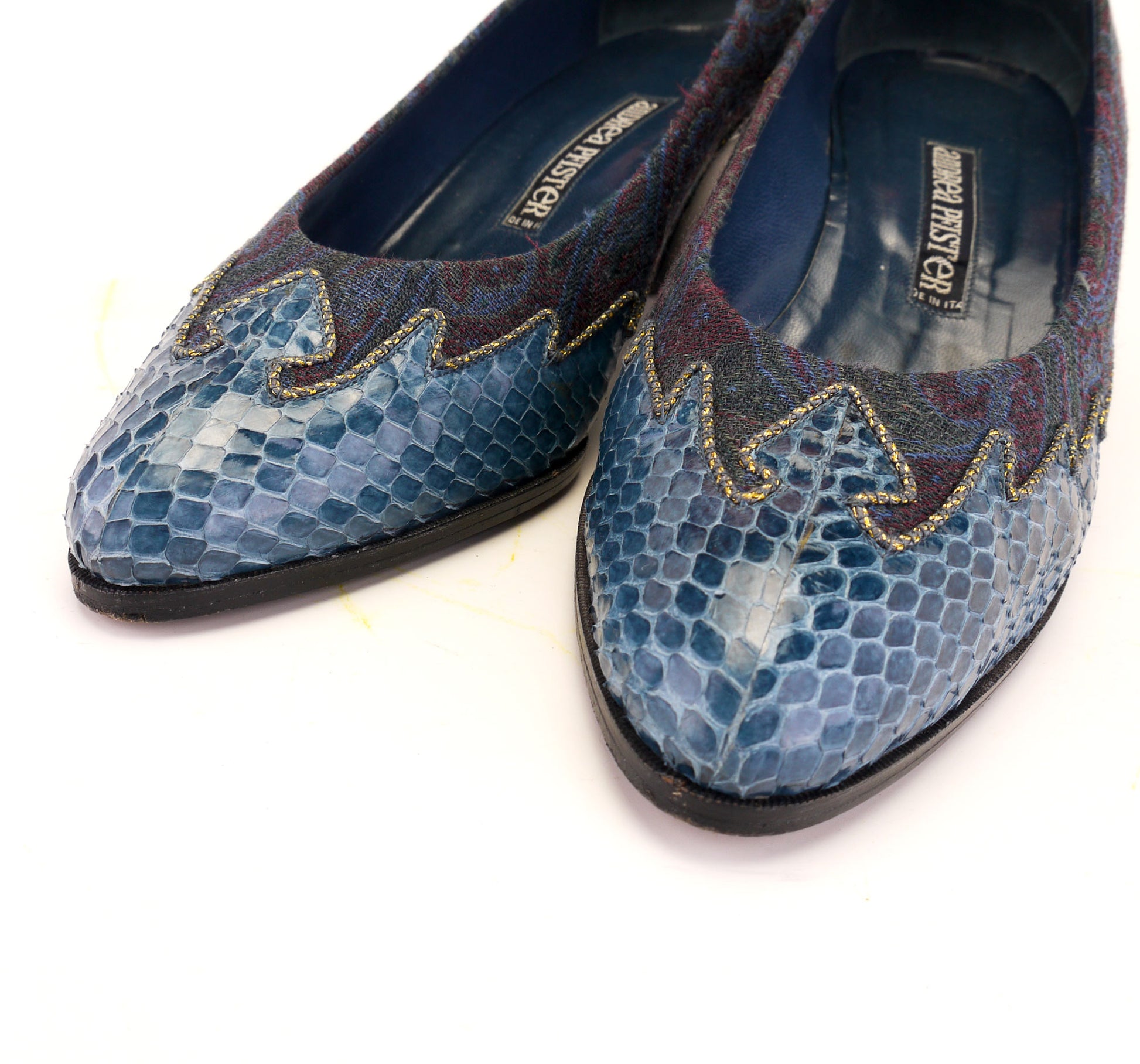 1980s Andrea Pfister Blue Brocade & Snakeskin Pumps