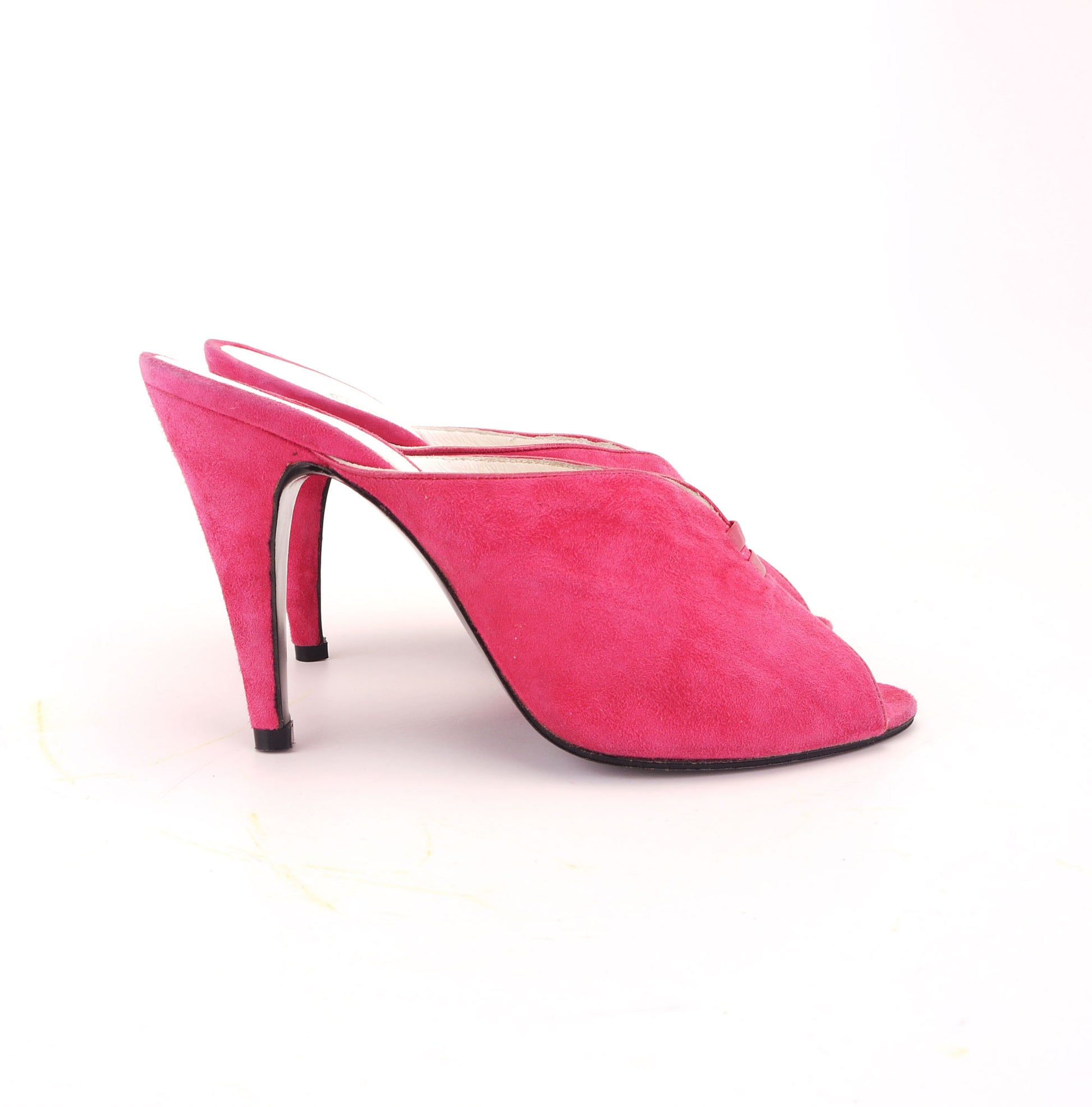 Classic 80s fucshia pink suede mules. Made in Italy for Franco Eboli by Nicolini. Early 80s design with high cut vamp in two pieces joined by 2 short leather straps. 4 inch stiletto heel. Leather upper, lining and soles.