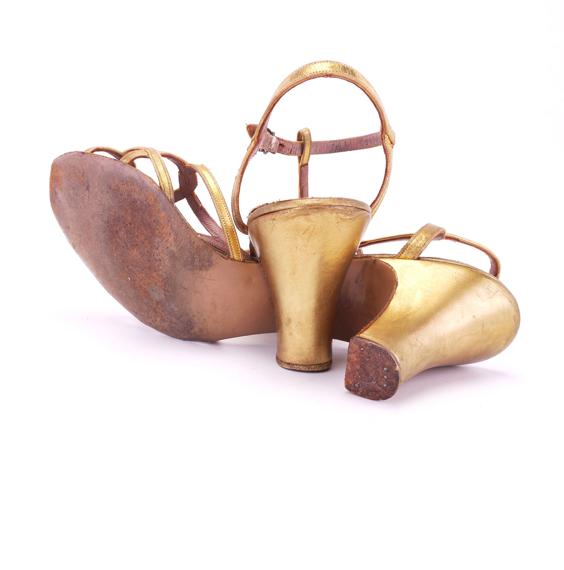 Beautiful gold evening sandals spanning the end of the 40s to early 50s. Criss-cross strapped vamp with t bar which rises to a think anklet strap with gilt buckle. Sturdy 3 inch spanish heel. Leather upper, lining and soles. Made for the Hudson Bay Co (Canada) in England.