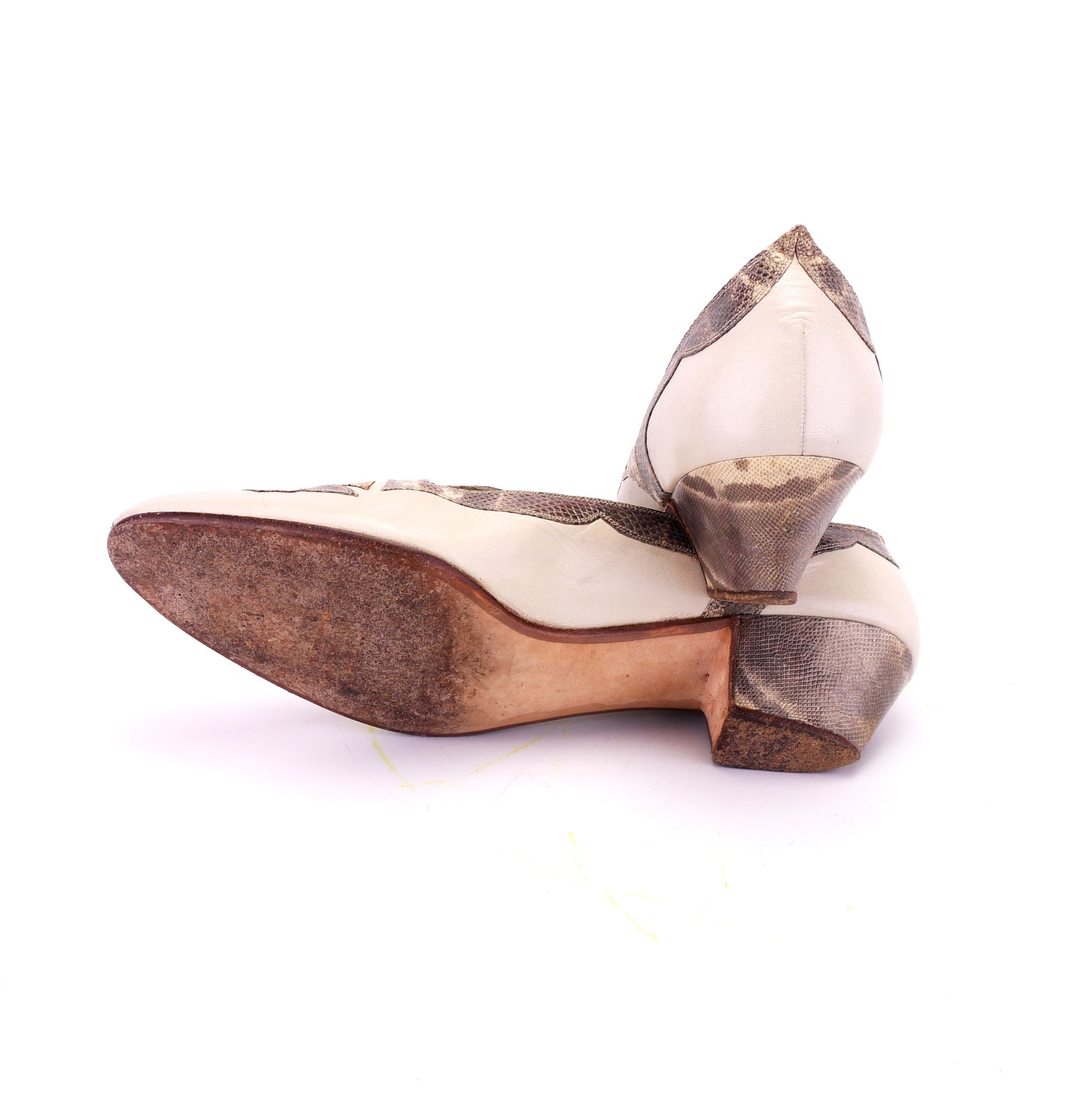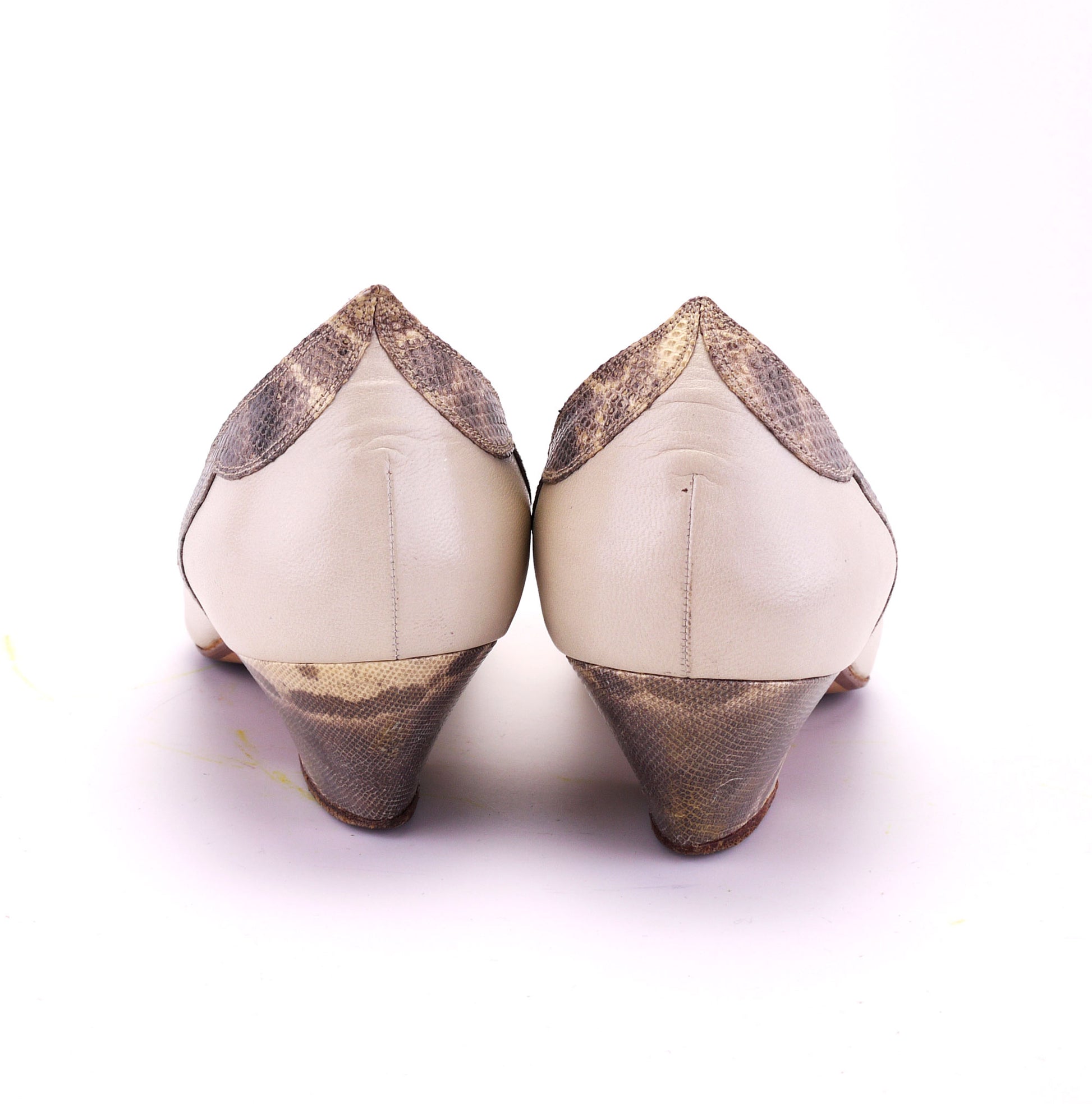 Early 1980s low heel pumps by Italian master Andrea Pfister. Cream leather with metallic faus lizard and snake appliques. Extended vamp and heel, dipped sides. Almond toe, 1.5 inch chiselled heel. Leather upper, lining and soles.