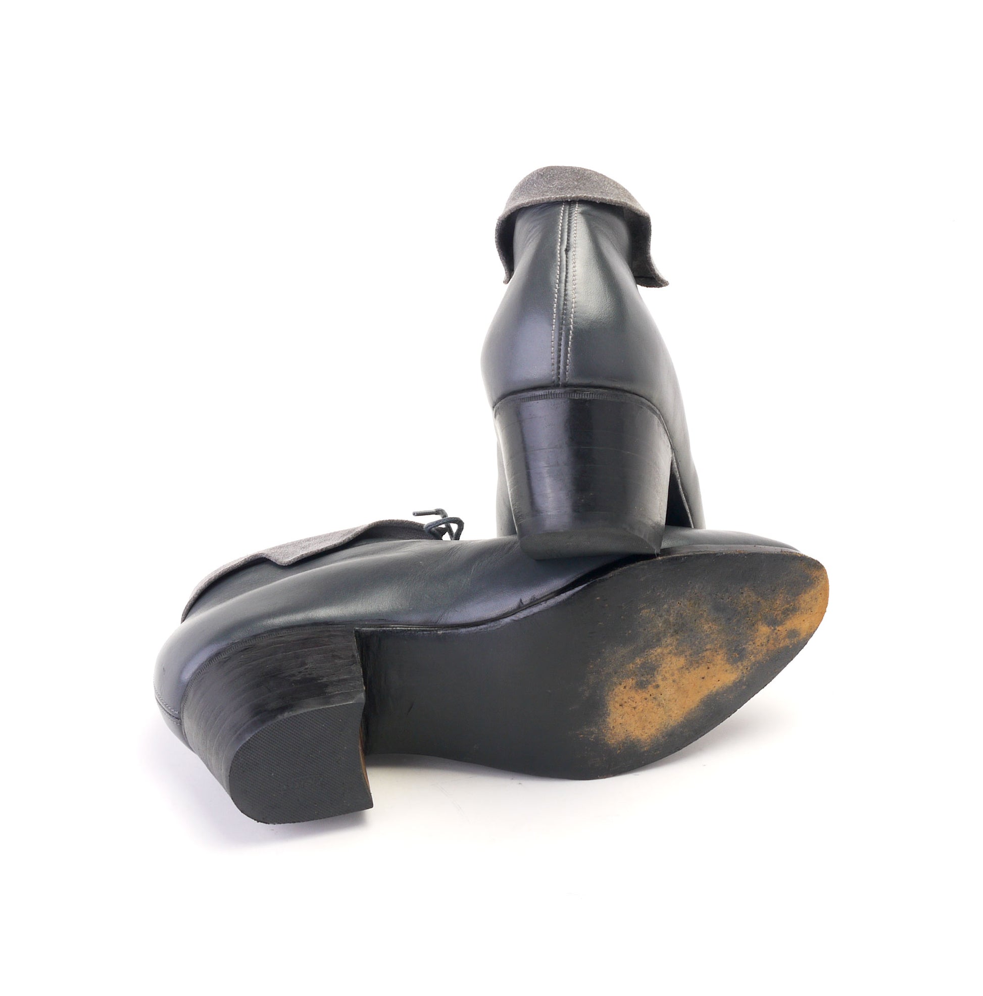 Grey leather ankle boots with a shaped suede collar and 2.25 inch stacked black heel.