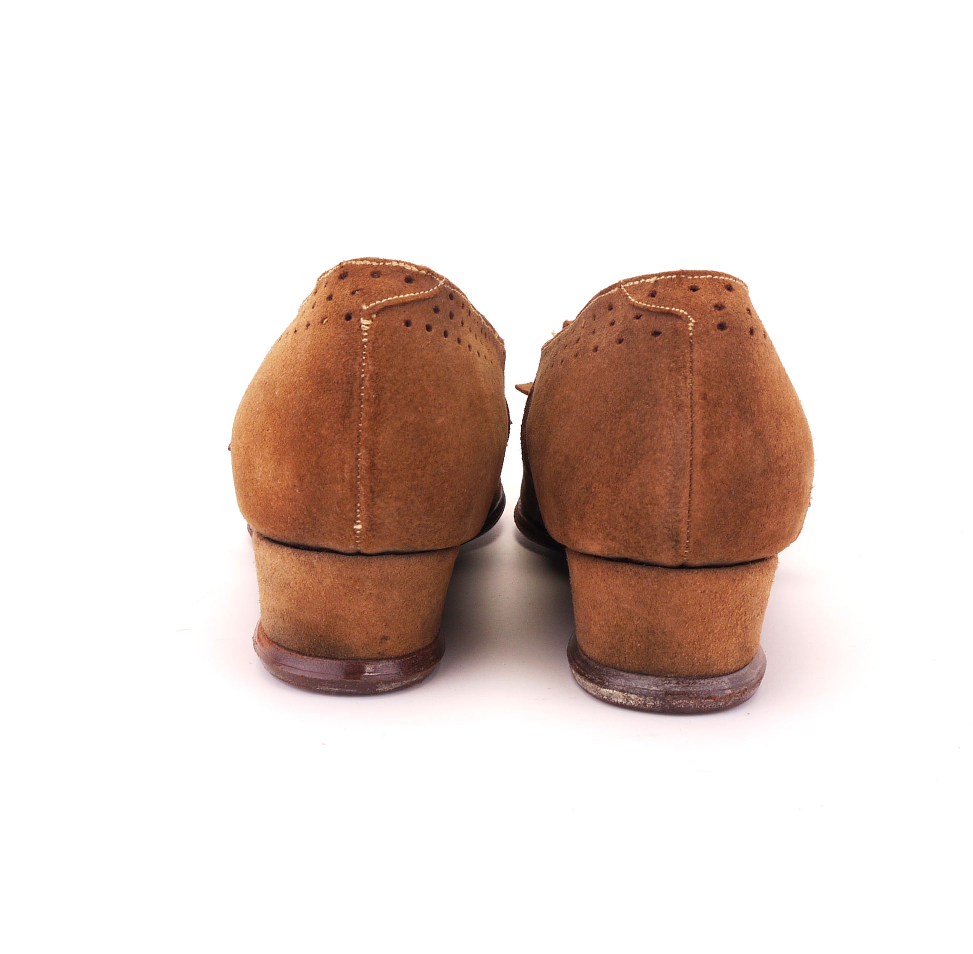 Late 40s into early 50s casual wedge shoes with a square walled toe and 1.5 inch wedge heel. Light brown suede with perforated vamp and fringed tab under a narrow strap. Elastic under to aid fit. Welted sole. Label is Panda. Leather upper and soles, leather and textile lining.