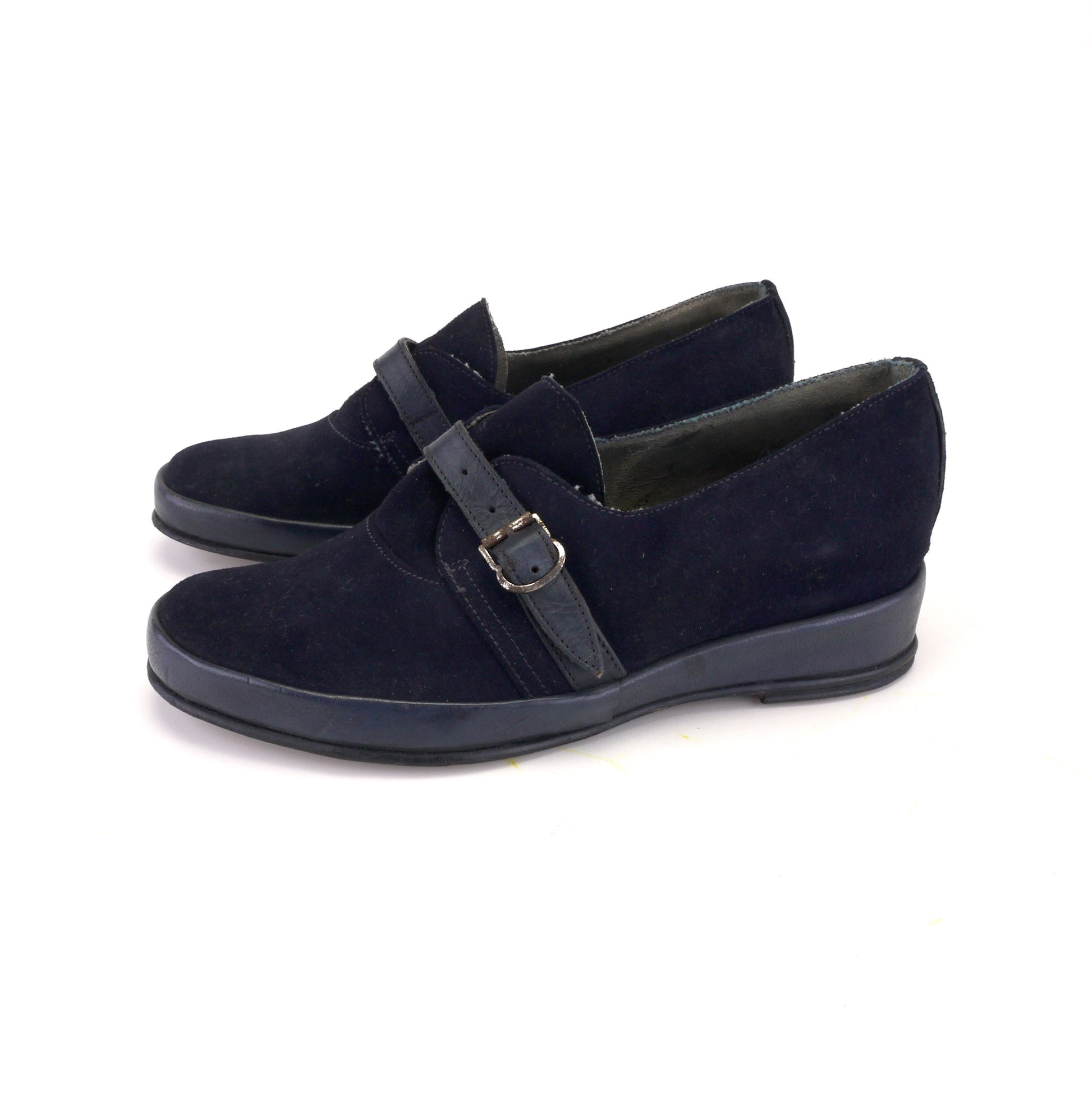 Unworn navy suede and leather low wedges with a leather strap and mudguard. Low 1.5 inch wedge heel. Steel buckle. Leather upper and soles, faux leather and textile lining.