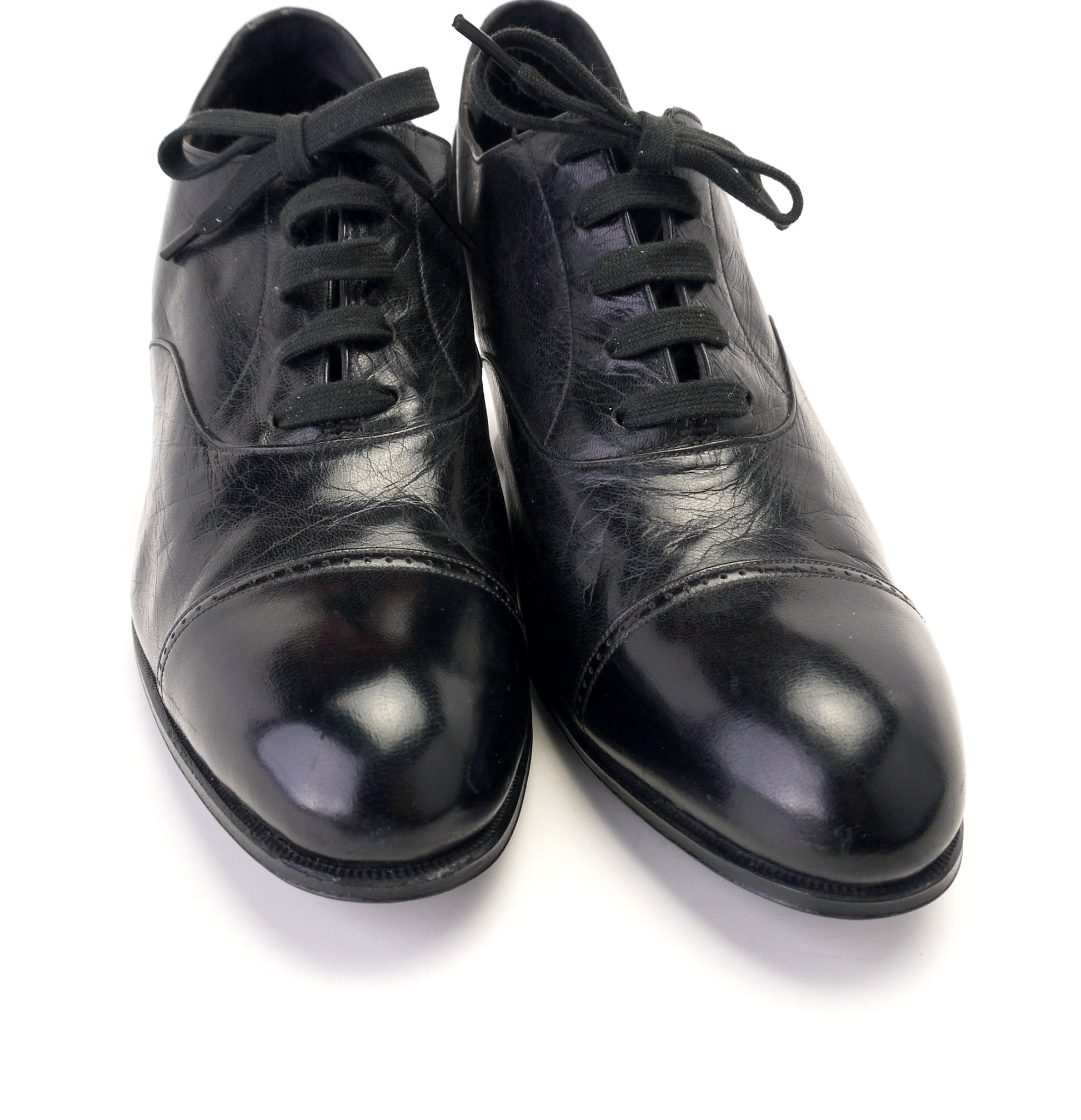 Unworn black oxfords with welted sole and Louis heel. The Salon Shoe in classic style. Plain toe cap with punched edge. Pieced vamp and quarters. Pointed toe and 2.25 inch waisted heel. Leather upper and soles, leather and textile lining.