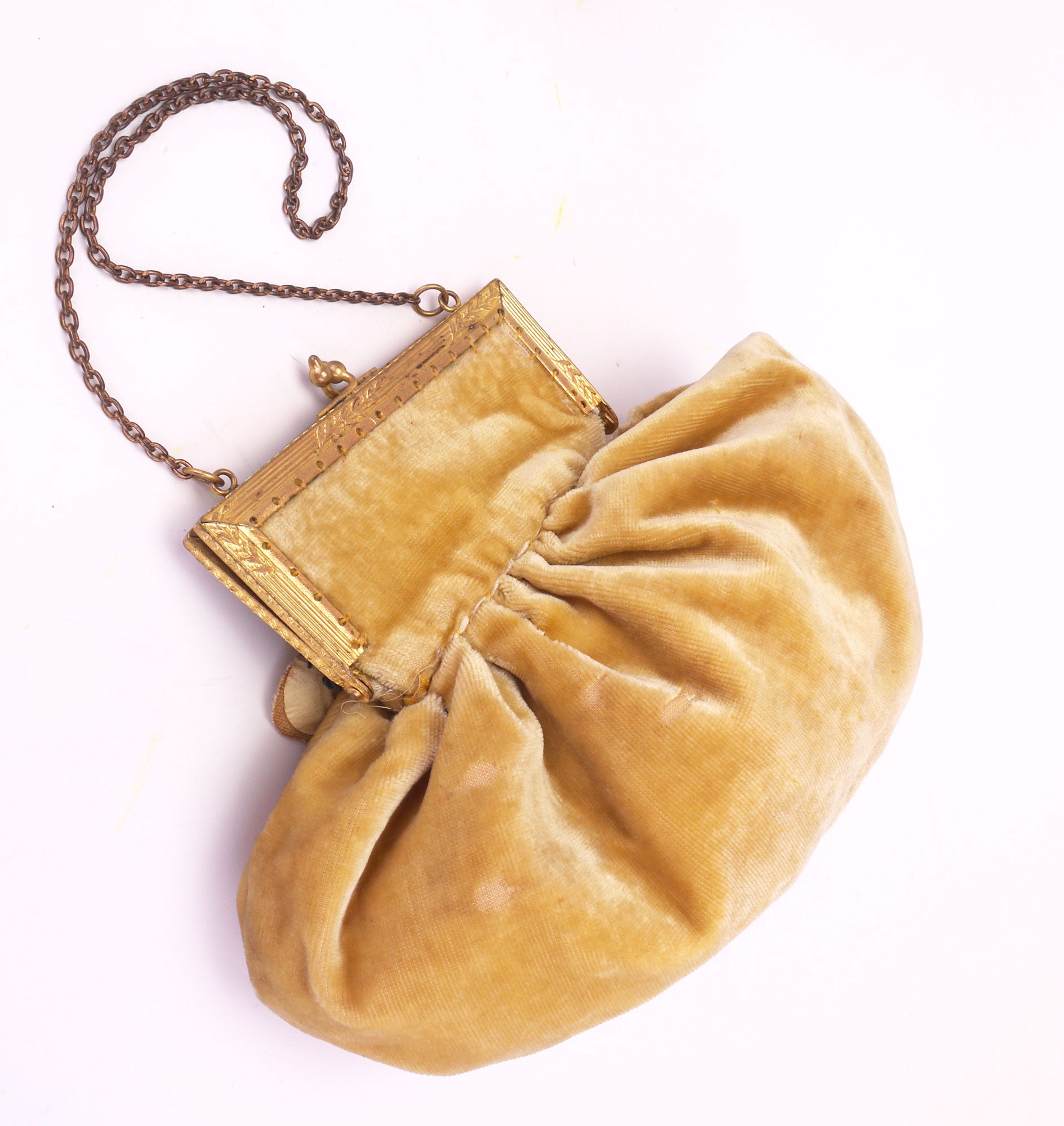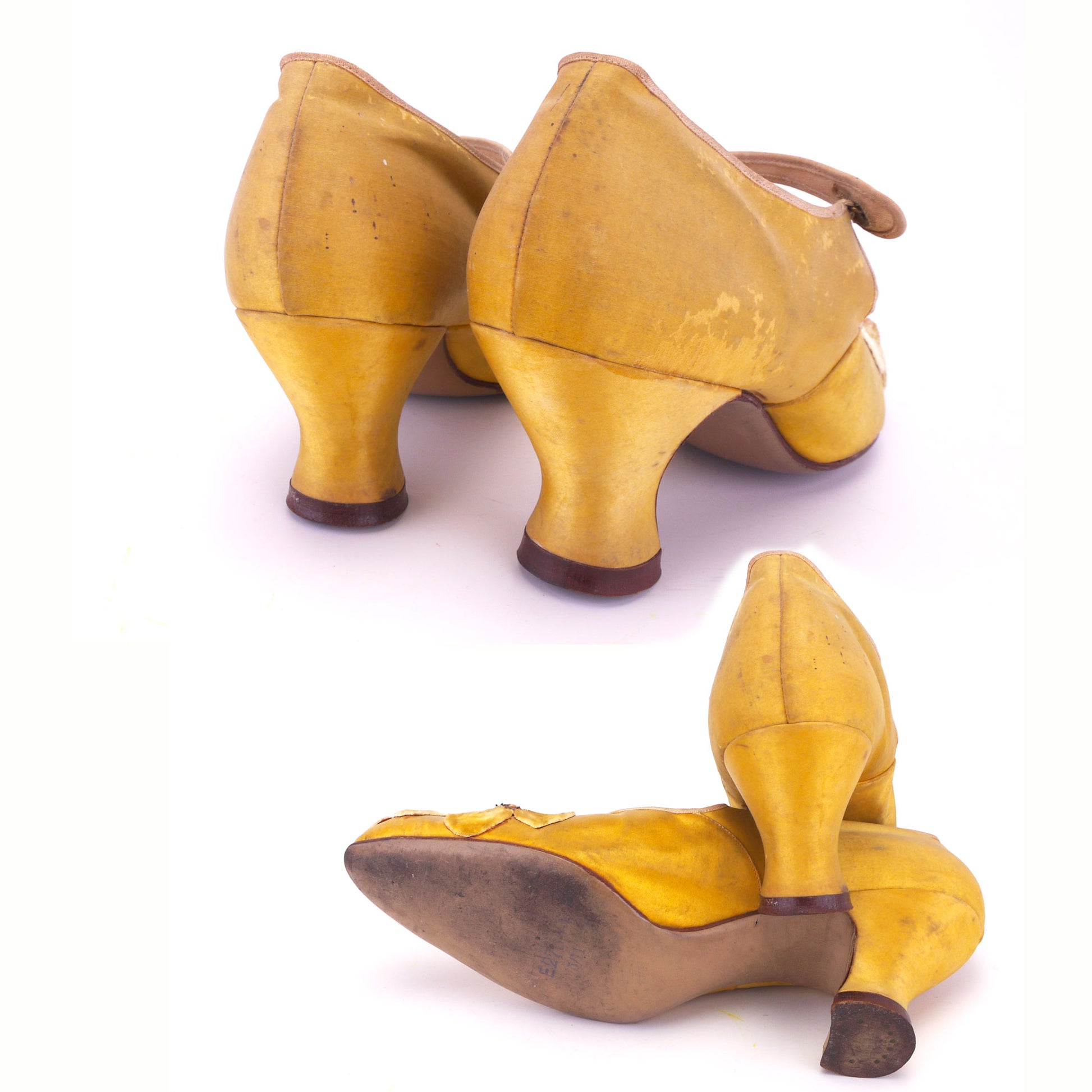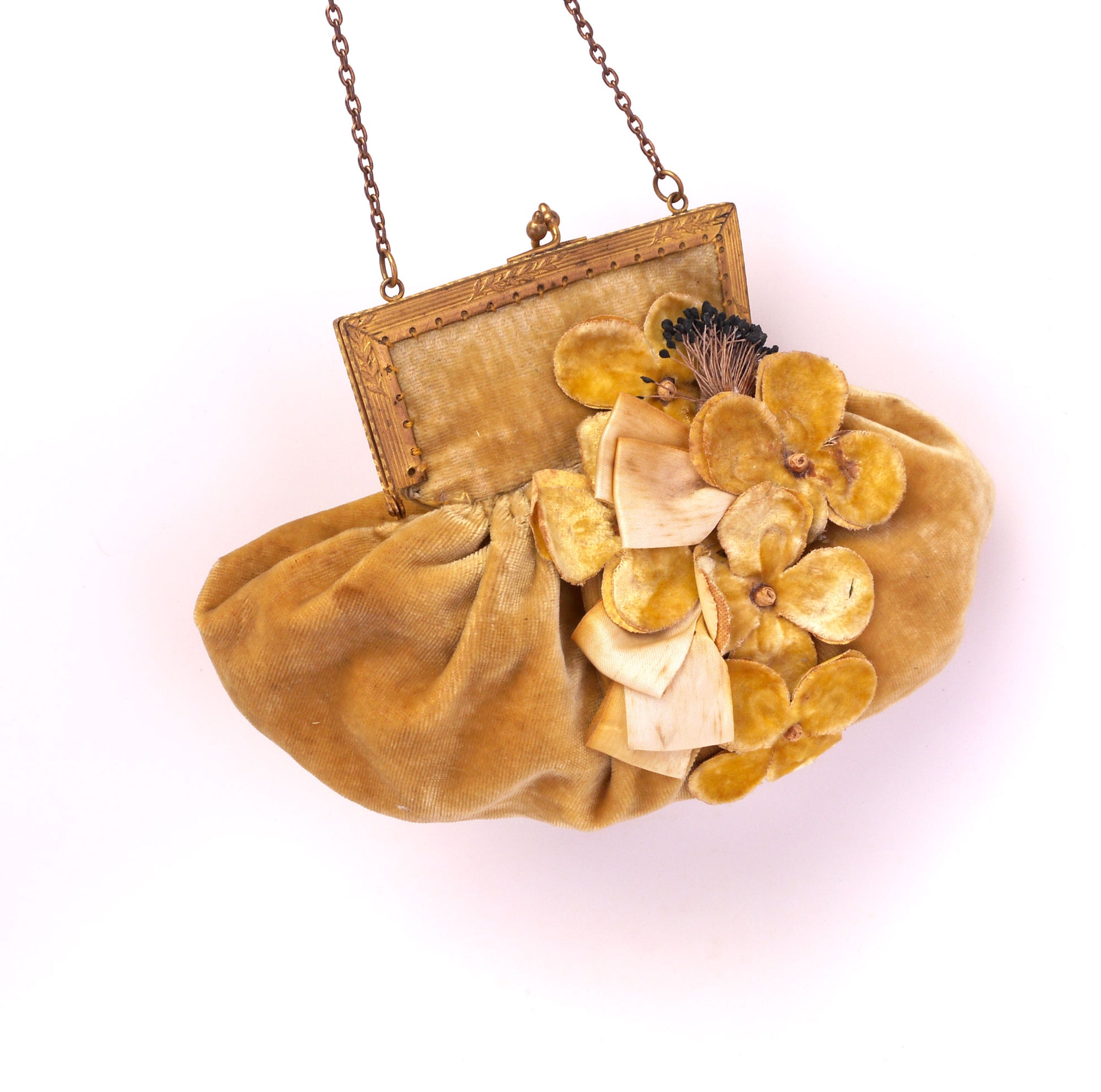 Deep golden yellow satin bar shoes trimmed with velvet flowers and matching velvet frame bag with a chain handle. Made in Czechoslovakia c 1920. The shoes have a pointed toe and 2.75 inch Louis heel. they fasten with a gilt and rhinestone button. the front has an arrangement of velvet flowers and black paper stamens. The velvet reticule has a similar flower arrangement with added satin ribbons. Gilt frame. The inside is cream trimmed with lemon and blue ribbon. Probanly custom dyed. Leather soles, cotton lining for the shoes.